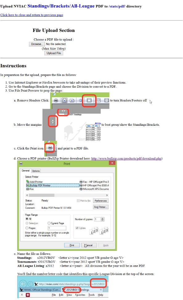 At the end of the season, it is no longer necessary for the Standings and Tourney Brackets to be live. The Statistician will use the use the Google Chrome browser or the Internet Explorer browser to save an Adobe Reader (PDF) version of the Standings and Tournament results pages. The pages will then be uploaded to the archive folder on the web site. When the Standings and Tournaments pages are generated, they check for a PDF for each Division and use that link on the page if it exists. Otherwise, it shows the link to the live pages in use during the season. Since the Standings occur just before the Tournament, you may upload the Standings when they are complete and then upload the Tournament results when the Tournament has ended.