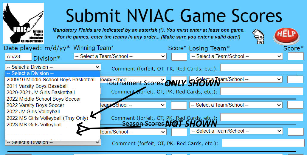 Team Code Entry Accuracy: To ensure the accuracy of the teams entered for every game, all teams for the specific Division show in drop down lists (#1 & #3 above) in the Winning Team and Losing Team columns. This eliminates using an incorrect team code for a team and the resulting lost of that game in the statistics.
